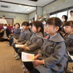 演奏を聴くだけでなく、鳴らし方や大きさによっての音の違い等、ハンドベルについてたくさん教えて頂きました。一番大きなハンドベルを鳴らすと低い音が鳴りました。その音を聞いて「お寺にある鐘と同じ音に聞こえる」という子がいて、我が園ならではの感想に思わず笑ってしまいました。