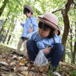 森に入ると、子どもたちは喜んでドングリやクヌギ、セミの抜け殻など秋ならではの自然物を見つけてはお互いに教え合ったり、見せ合ったりしていました。