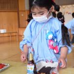 年中組さんに準備してもらい、一人ひとりが自由にトッピングを楽しみ「ミニパフェ」を作りました。「一人何個まで」と決まっている食材があったのですが、分からなくなるときちんと年中組に聞き、年中組もまた、それに対し的確に答えていました。大人が仲介に入らなくても、子ども達だけでこんなにやりとりが上手になったことにも成長を感じました。
