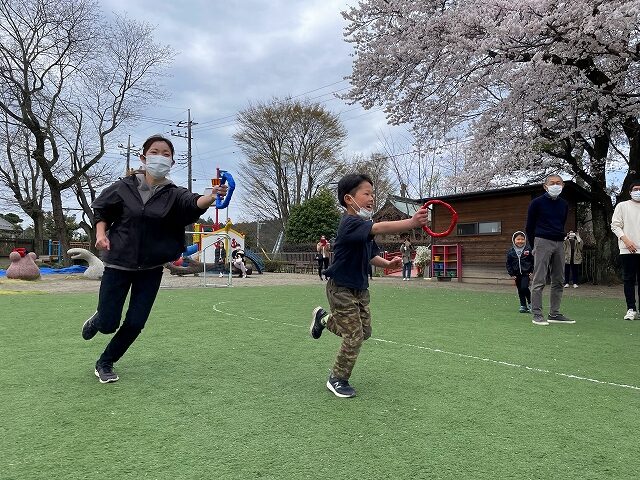 お弁当を食べ終わると、お母さん達も一緒になって、かくれんぼや だるまさんが転んだ、鬼ごっこなど自由遊びに。
