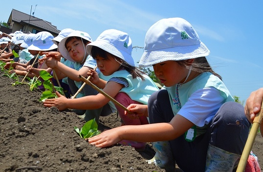 年長さんが5月に苗植えをし、雑草むしりをするなど面倒を見てくれたお芋が立派に育ちました。今日は全園児でお芋ほりです。畑に行く道から「おっきいの掘りたいな、いーっぱい掘るんだ、掘るぞー!」と楽しみと期待とやる気がいっぱいです。
